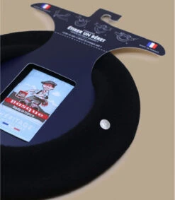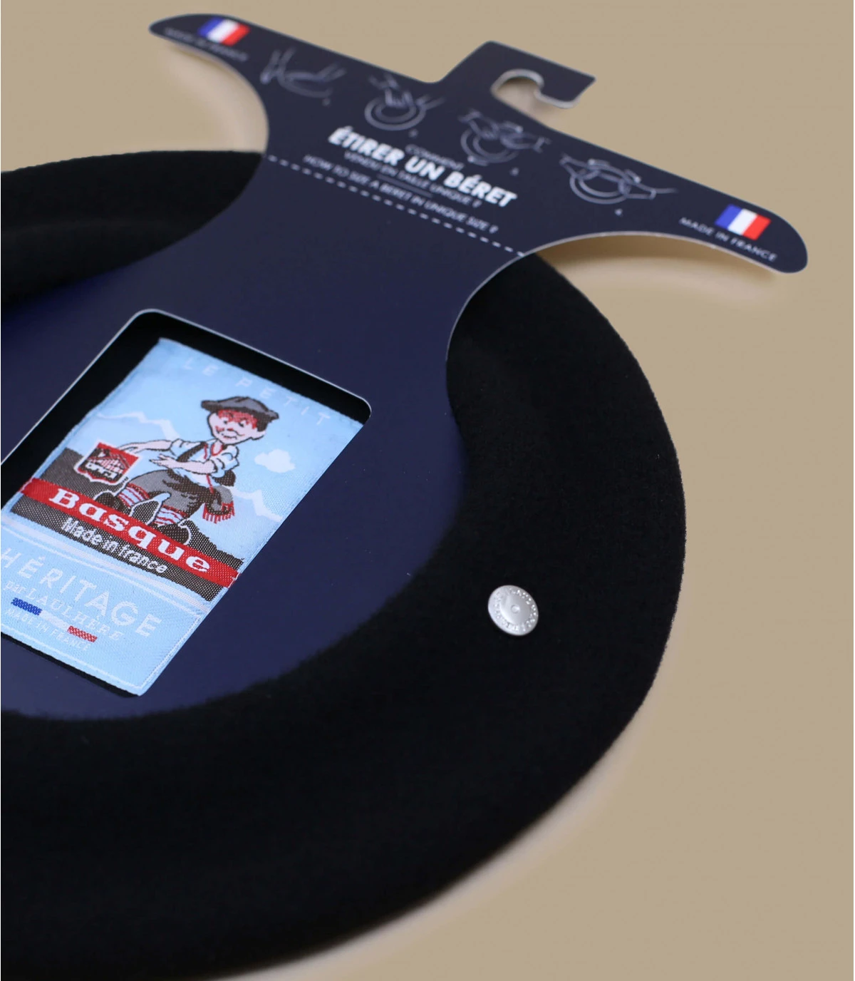 BĂ©ret basque pour enfant de couleur noire. Pin’s Laulhère. Doublure satinĂ©e de couleur noire avec Ă©cusson cousu Ă l’intĂ©rieur. BĂ©ret livrĂ© dans sa boite spĂ©ciale.