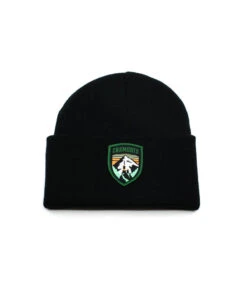 Perché sur un éperon rocheux, le téléphérique de l’aiguille du midi se détache sur fond de massif du Mont Blanc. Ce symbole de la ville de Chamonix, repris dans un style rétro qui rappelle les affiches touristiques anciennes, s’affiche sur un bonnet noir à revers, simple et doux.