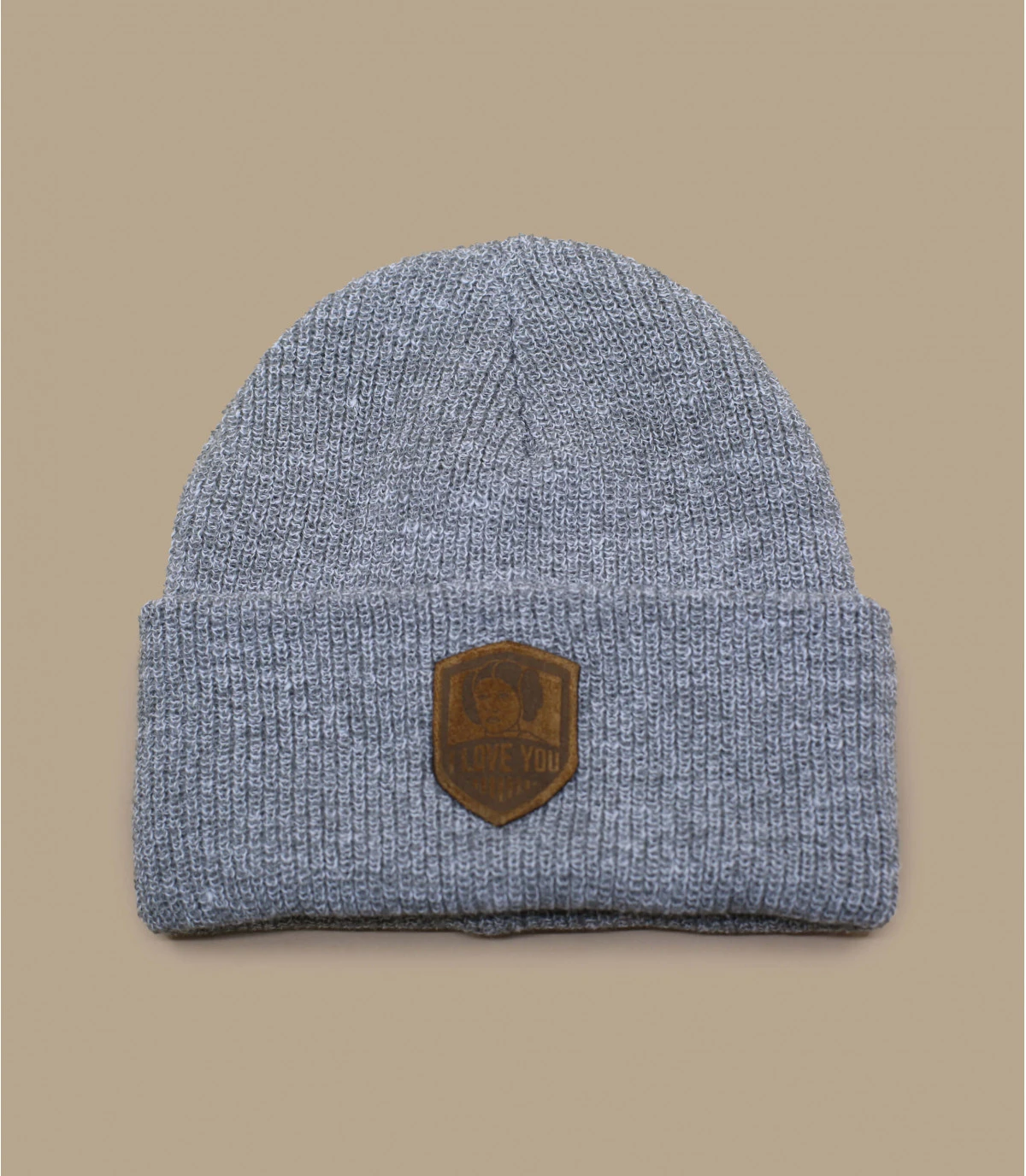 Bonnet gris à revers décoré d’un patch en cuir gravé à l’effigie de la princesse et de sa fameuse phrase à son aimé sur le point d’être congelé vivant. À porter en duo avec le bonnet reprenant la réponse du contrebandier…