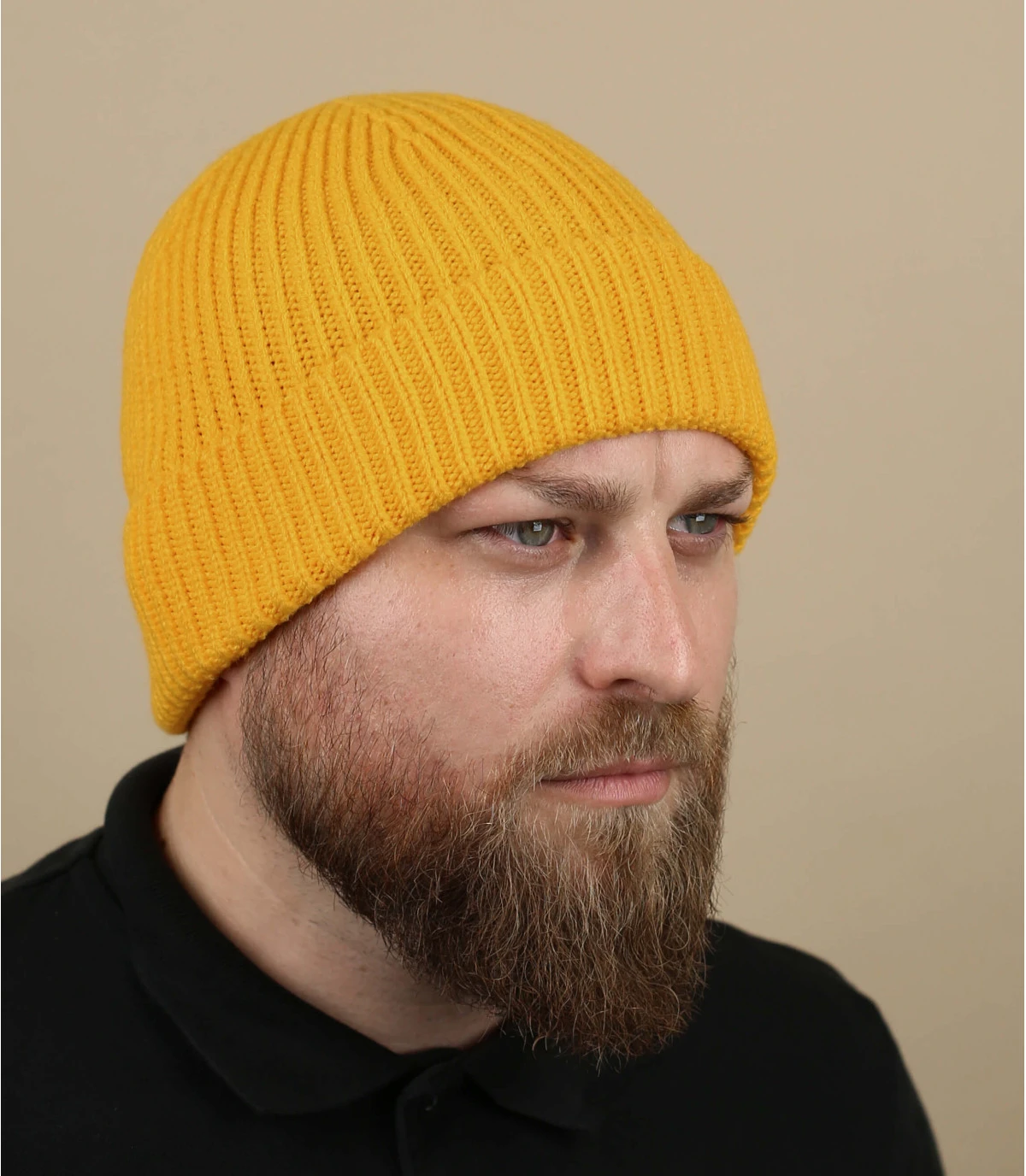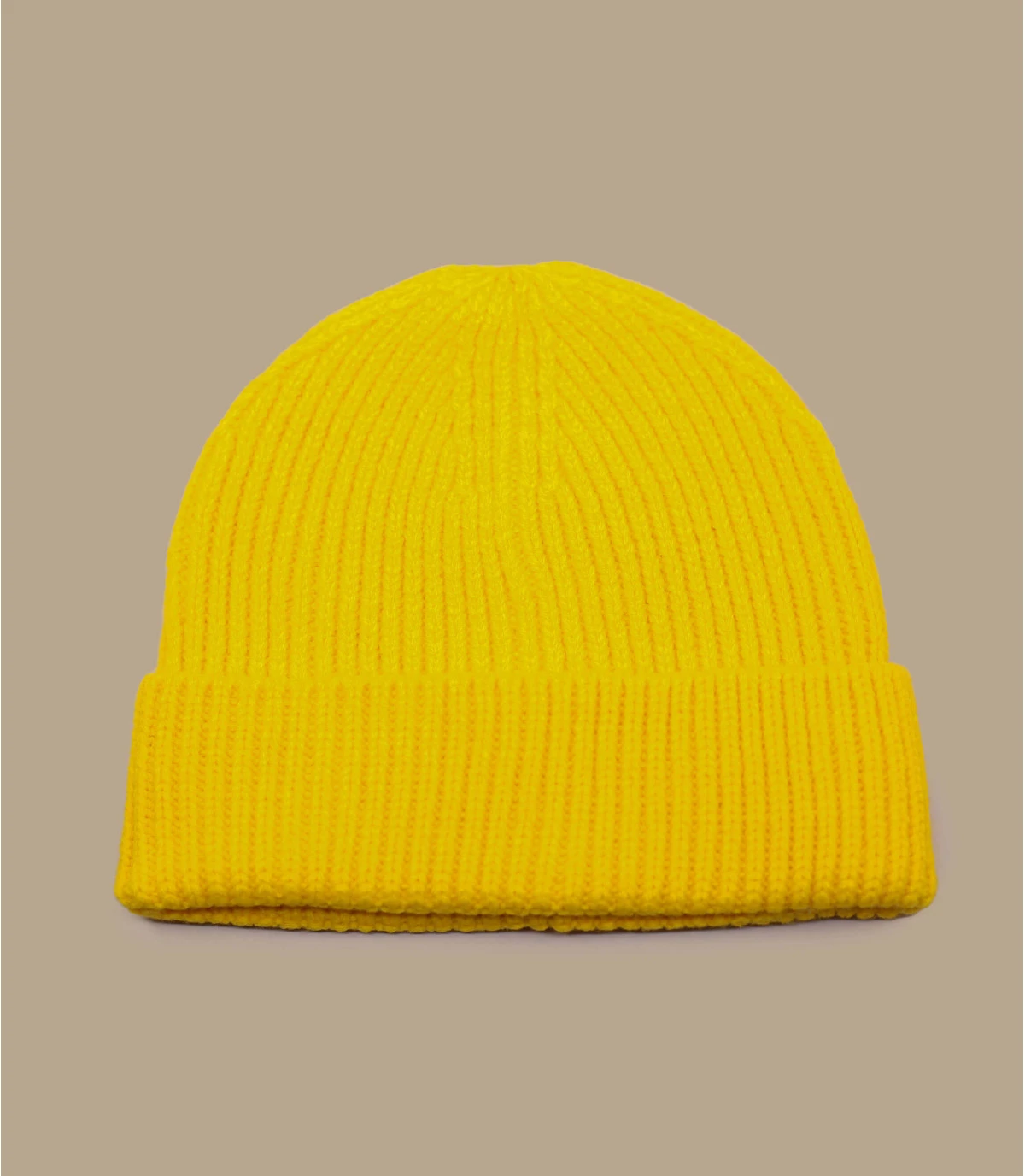Bonnet revers en maille acrylique de couleur jaune. Taille unique : 55-60 cm de tour de tĂŞte.